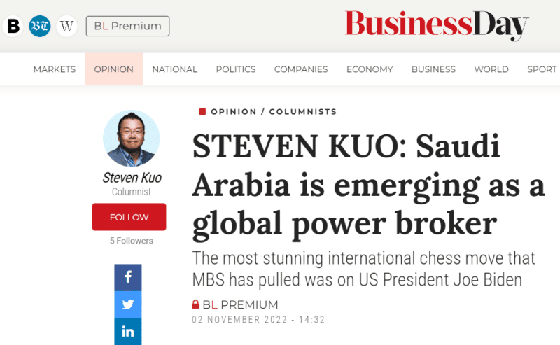 قالت صحيفة Business Day: إن ولي العهد الأمير محمد بن سلمان أذهل العالم بما يُمكن وصفه بأنها حركة مدروسة في لعبة شطرنج قوية، وهي تلك التي تخص التعامل مع الرئيس الأمريكي، جو بايدن، وأيضًا الصراع الدولي الروسي الأوكراني.