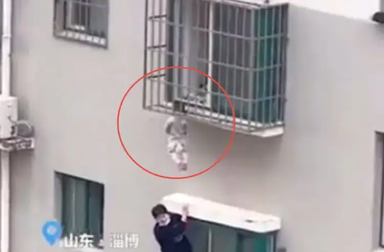 وثق مقطع فيديو منتشر على مواقع التواصل الاجتماعي، لحظة إنقاذ رضيع عمره عام في مقاطعة شاندونغ بالصين، حيث عُلقت رأسه في شرفة مسكنه بالطابق الخامس، بعد أن تركه أهله وحده.