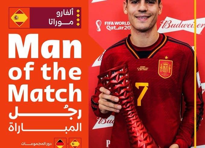 وفاز ألفارو موراتا مهاجم فريق أتلتيكو مدريد، بجائزة أفضل لاعب في مباراة منتخبي إسبانيا وألمانيا، ضمن منافسات الجولة الثانية من المجموعة الخامسة لبطولة كأس العالم “قطر 2022”.