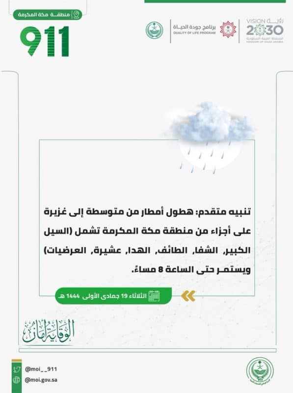 أصدر المركز الوطني للعمليات الأمنية بوزارة الداخلية (911)، تنبيهًا متقدمًا، بهطول أمطار على أجزاء من منطقة مكة المكرمة، تستمر حتى المساء.