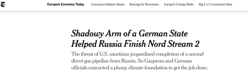 قالت صحيفة نيويورك تايمز إن التهديد بفرض عقوبات أمريكية عرض استكمال خط أنابيب الغاز الثاني المباشر من روسيا، نورد ستريم 2، للخطر، لذلك ابتكرت الشركة الروسية غازبروم والمسؤولون الألمان مؤسسة زائفة لإنجاز المهمة.