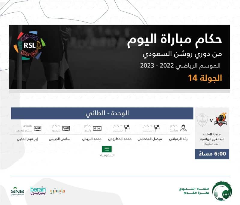 ويتولى رائد الزهراني مهمة إدارة مباراة اليوم، ويساعده فيصل القحطاني ومحمد المطرودي، والحكم الرابع محمد البريدي، وسيكون سامي الجريس حكمًا لتقنية الفيديو، ويساعده إبراهيم الدخيل.