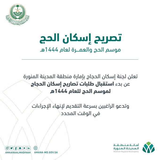 أعلنت لجنة إسكان الحجاج فـي المدينة المنورة، اليوم الاثنين، عن بدء استقبال طلـبـات تـصـاريـح إسكان الحجاج لموسم الحج للعام 1444هـ.