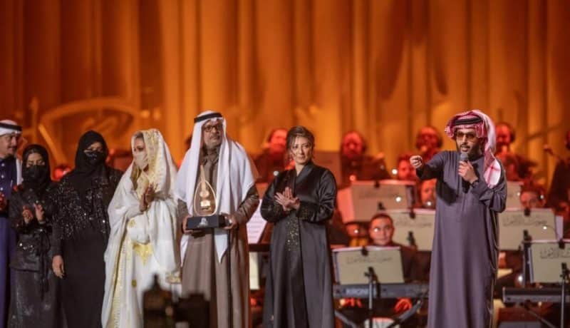 وتسلم جائزة التكريم من تركي آل الشيخ، نجل الفنان عبدالله، وسط حفاوة من الحاضرين في موقع التكريم.