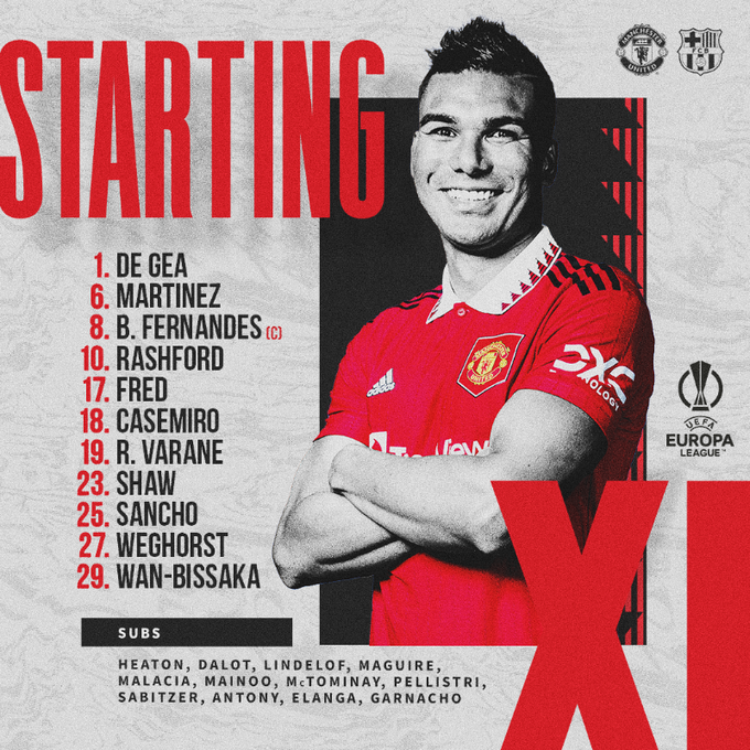 كشف المدربان، الهولندي إريك تين هاج والإسباني تشافي هيرنانديز تشكيلة مباراة مان يونايتد ضد برشلونة في إياب دور خروج المغلوب في بطولة الدوري الأوروبي لكرة القدم موسم 2022/ 2023.