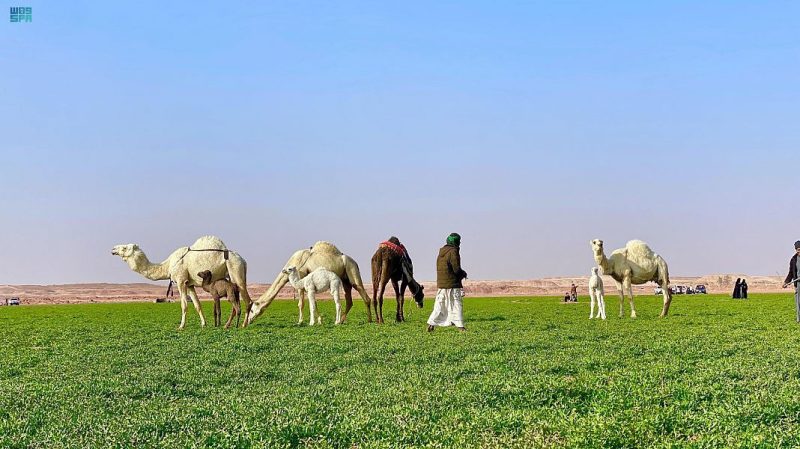 وفي مزيج بين شموخ الإبل وجمالها, وخضرة عشب الربيع تتشكل لوحات طبيعية في صحاري الجوف تستهوي المتنزهين يجلسون بجوارها يتابعون معرضاً خلقه الله وجمله بخضرة الربيع وأعجوبة الجمل, وتتسابق عدساتهم للاحتفاظ بلقطات جمالية لهذه اللوحات الطبيعية .
