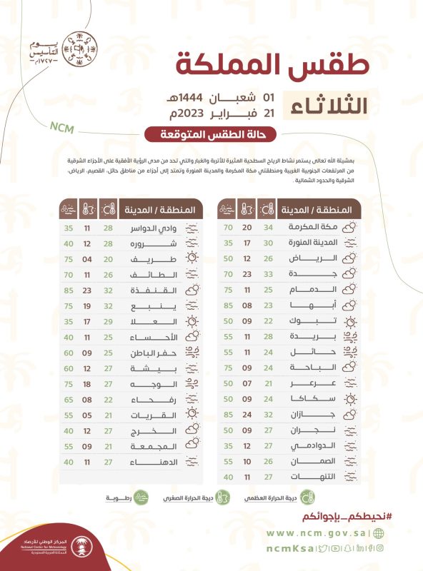 من جهته، توقع المركز الوطني للأرصاد في تقريره عن حالة الطقس لهذا اليوم – بمشيئة الله تعالى – نشاط الرياح السطحية المثيرة للأتربة والغبار، والتي تحد من مدى الرؤية الأفقية على الأجزاء الشرقية من المرتفعات الجنوبية الغربية ومنطقتي مكة المكرمة والمدينة المنورة وتمتد إلى أجزاء من مناطق حائل، القصيم، الرياض، الشرقية والحدود الشمالية.