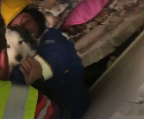 وأظهرت لقطات فيديو لعملية الإنقاذ فرقًا تزحف تحت أنقاض مبانٍ مهدمة تنادي اسم الكلب قبل أن يخرج شخص مع كلاب الهاسكي بين ذراعيهم.