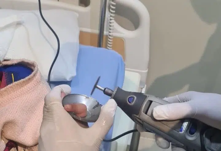ونشر المدني صورة ليد الطفلة وهي عالقة بداخل قطعة معدنية، حيث تتواجد بداخل حجرة بالمستشفى.