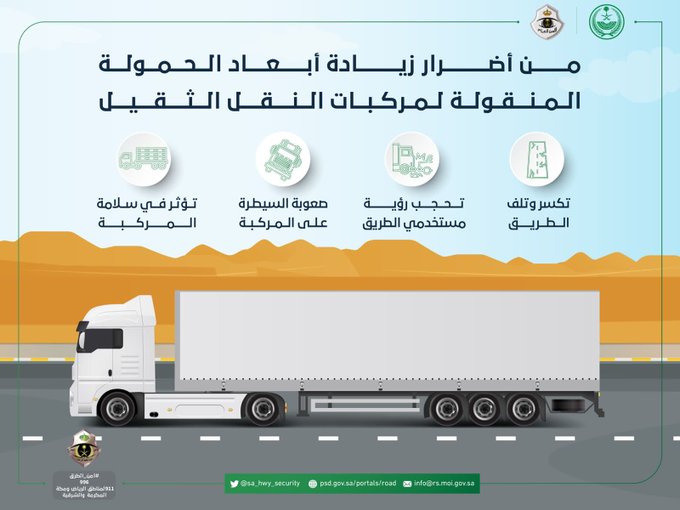 وقالت قوات أمن الطرق عبر موقع تويتر: إن زيادة الحمولة عن الحد المسموح به تتسبب في كسر وتلف الطريق، وحجب رؤية مستخدمي الطريق، وصعوبة السيطرة على المركبة، كما تؤثر على سلامتها.