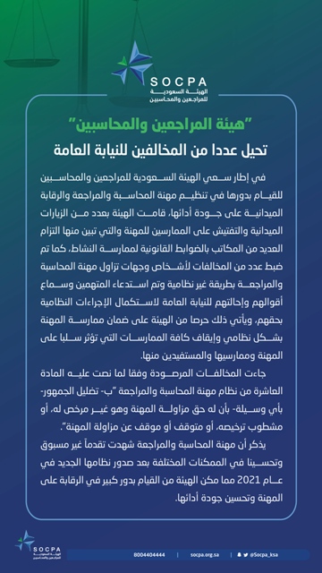في إطار سعي الهيئة السعودية للمراجعين والمحاسبين للقيام بدورها في تنظيم مهنة المحاسبة والمراجعة والرقابة الميدانية على جودة أدائها، قامت الهيئة بعدد من الزيارات الميدانية والتفتيش على الممارسين للمهنة والتي تبين منها التزام العديد من المكاتب بالضوابط القانونية لممارسة النشاط، كما تم ضبط عدد من المخالفات لأشخاص وجهات تزاول مهنة المحاسبة والمراجعة بطريقة غير نظامية وتم استدعاء المتهمين وسماع أقوالهم وإحالتهم للنيابة العامة لاستكمال الإجراءات النظامية بحقهم، ويأتي ذلك حرصًا من الهيئة على ضمان ممارسة المهنة بشكل نظامي وإيقاف كافة الممارسات التي تؤثر سلباً على المهنة وممارسيها والمستفيدين منها.