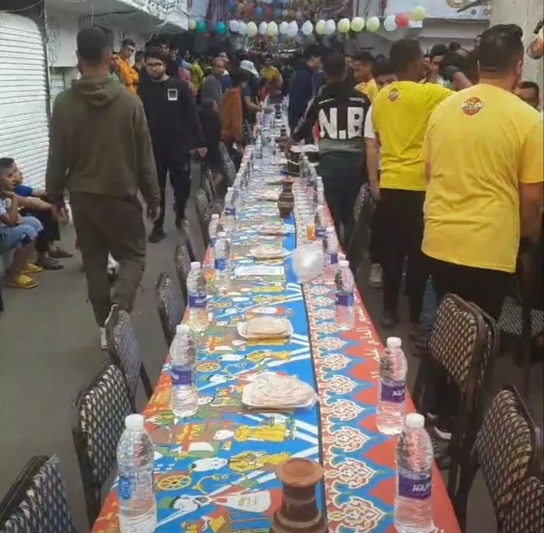 التف الأهالي بعزبة حمادة بحي المطرية الشعبي بالعاصمة المصرية القاهرة، اليوم الخميس، حول أكبر مائدة إفطار رمضانية، وسط أنوار وبلالين ورسومات على الجدران، وزغاريد وأغانٍ وضحكات يضج بها المكان، وآلاف الأشخاص يتجمعون للأكل معًا ومنهم من يتشاركون نفس الطبق.