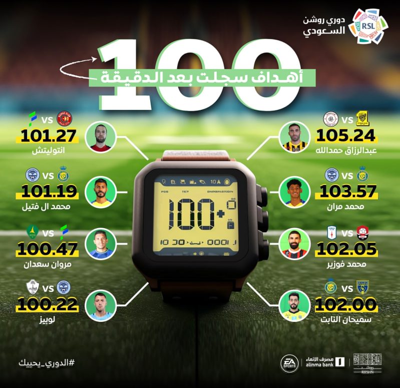 وجاءت الأهداف بعد الدقيقة 100 في دوري روشن السعودي، كالتالي؛ هدف نجم الاتحاد، المغربي عبدالرزاق حمدالله أمام الشباب عند الدقيقة 105:24، هدف لاعب النصر، محمد مران ضد الباطن عند الدقيقة 103:57.