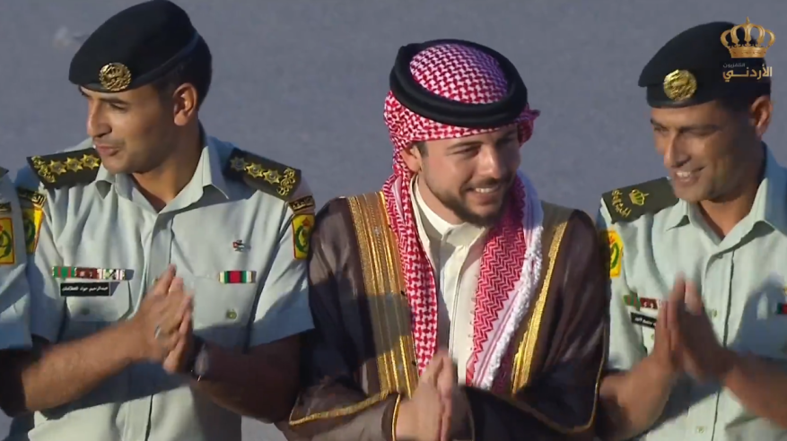انتشر مقطع فيديو متداول لمشاركة رفاق ولي العهد الأردني الأمير الحسين، في القوات المسلحة الفرحة بمناسبة حفل زفافه على رجوة آل سيف.