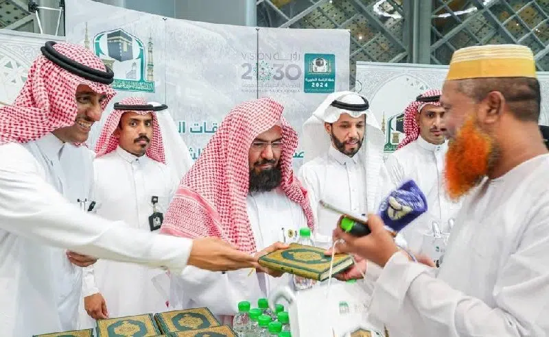 كما شارك الرئيس العام لشؤون المسجد الحرام والمسجد النبوي الشيخ الدكتور عبدالرحمن بن عبدالعزيز السديس، في توزيع الهدايا على حجاج بيت الله الحرام، وذلك بجناح الرئاسة في محطة قطار الحرمين بمكة المكرمة.