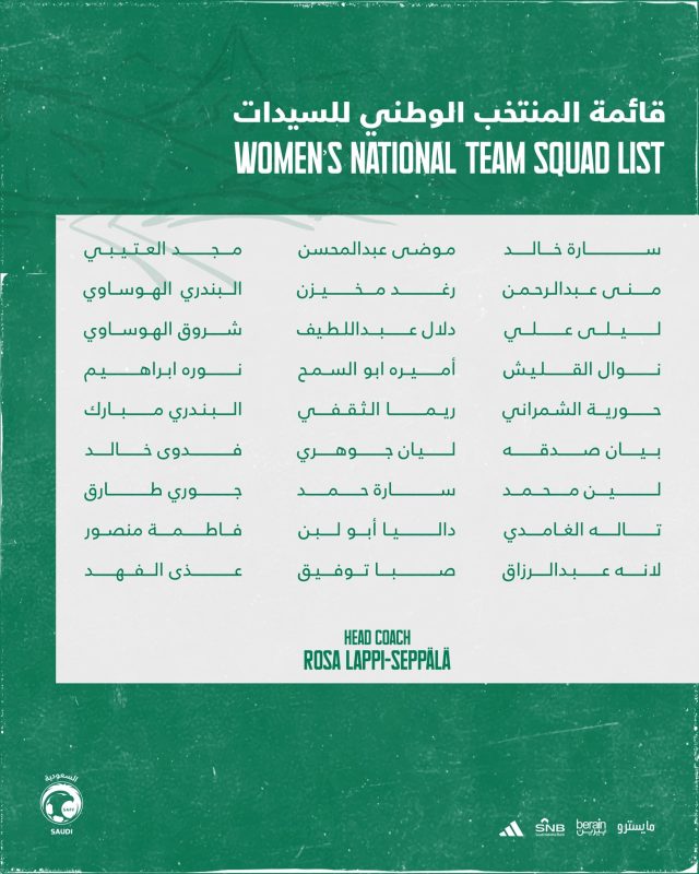 واستدعت الفنلندية روزا لابي سيبالا 27 لاعبة لمعسكر المنتخب السعودي للسيدات، وهن؛ سارة خالد، منى عبدالرحمن، ليلى علي، نوال القليش، حورية الشمراني، بيان صدقة، لين محمد، تالة الغامدي ولانه عبدالرزاق.