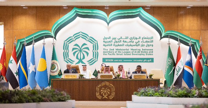 تلبية لدعوة كريمة من المملكة العربية السعودية، عقد وزراء خارجية الدول الأعضاء بجامعة الدول العربية ودول جزر الباسيفيك الصغيرة النامية الاجتماع الوزاري الثاني، وذلك يوم 12 / 6 / 2023م في مدينة الرياض، برئاسة سمو الأمير فيصل بن فرحان بن عبدالله وزير خارجية المملكة العربية السعودية (الدولة المضيفة)، وبمشاركة معالي الأمين العام لجامعة الدول العربية السيد أحمد أبو الغيط، وذلك لمواصلة تنمية جهود التعاون المشتركة بين الجانبين في المجالات الاقتصادية والتنموية والبيئية.