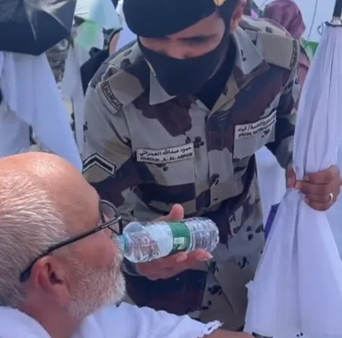 نشرت العربية السعودية مقطع فيديو يوثق لقطات لرجل أمن يسقي أحد الحجاج خلال الوقوف بعرفة اليوم الثلاثاء.
