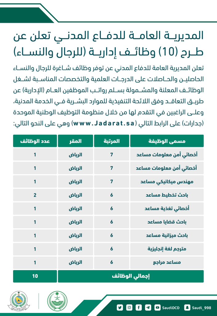 أعلنت المديرية العامة للدفاع المدني عن طرح (10) وظائف إدارية وهندسية وقانونية وتقنية (رجال / نساء) من خلال منظومة التوظيف الوطنية الموحدة (جدارات)، بالمرتبة (السادسة) و (السابعة)، وذلك وفقاً للتفاصيل وطريقة التقديم الموضحة أدناه.