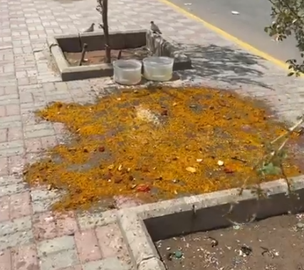 وفي هذا السياق، انتشر مقطع فيديو لمشهد يعتبر أحد أشكال التشوه البصري على أحد أرصفة الطرقات يوثق إلقاء بقايا طعام عبارة عن كمية كبيرة من الأرز مبعثرة على الأرض.