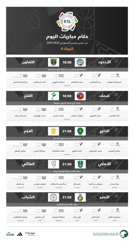 كشفت لجنة الحكام في الاتحاد السعودي لكرة القدم عن حكام مباريات اليوم الثلاثاء في الجولة الرابعة من مباريات الدوري السعودي للمحترفين ” دوري روشن”.