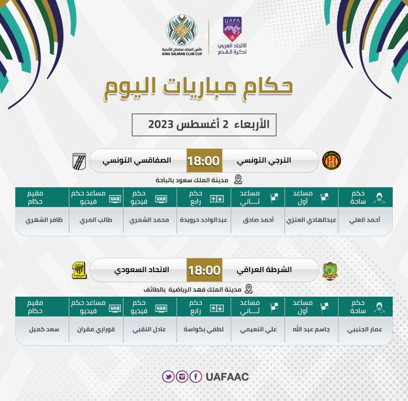 وفي ختام مباريات اليوم بكأس الملك سلمان للأندية العربية، يقود عمار الجنيبي لقاء الاتحاد والشرطة العراقي، ويساعده جاسم عبدالله وعلي النعيمي، الحكم الرابع لطفي بكواسة، حكم الفيديو عادل النقبي، ويساعده قوراري مقران، ومقيم الحكام سعد كميل.