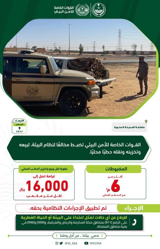 ضبطت القوات الخاصة للأمن البيئي، مقيمًا مخالفًا لنظام البيئة لبيعه وتخزينه أكثر من (6) أمتار مكعبة من الحطب المحلّي في منطقة المدينة المنورة.