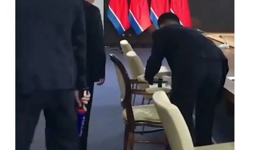 تداولت وسائل إعلام عالمية مقطع فيديو، يظهر حراس الزعيم الكوري الشمالي كيم جونغ أون، وهم منهمكون في تطهير كرسي كيم، قبيل الاجتماع الموسع مع الرئيس الروسي فلاديمير بوتين.