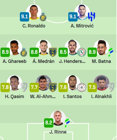 ويتواجد في وسط وهجوم التشكيل المثالي، كل من؛ ألفارو ميدران “التعاون”، جورادن هندرسون “الاتفاق”، مراد باتنا “الاتفاق”، وألكسندر ميتروفيتش “الهلال”، بالإضافة إلى نجمي النصر، كريستيانو رونالدو وعبدالرحمن غريب.