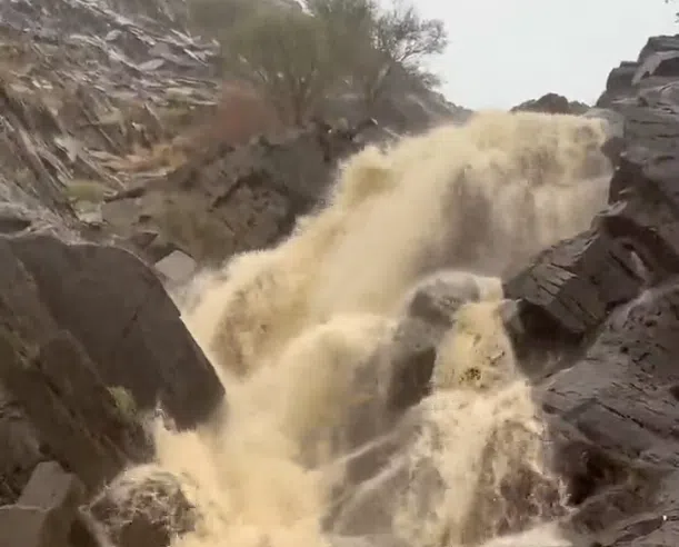 وثق مقطع فيديو تدفق الشلالات غرب الحبيل بمحافظة رجال ألمع بمنطقة عسير بعد هطول أمطار غزيرة على المنطقة.