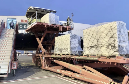 وتحمل الطائرة على متنها مساعدات إغاثية متنوعة شملت مواد غذائية وإيوائية وطبية تزن 39 طناً، وذلك ضمن الحملة الشعبية لإغاثة الشعب الفلسطيني الشقيق في قطاع غزة.