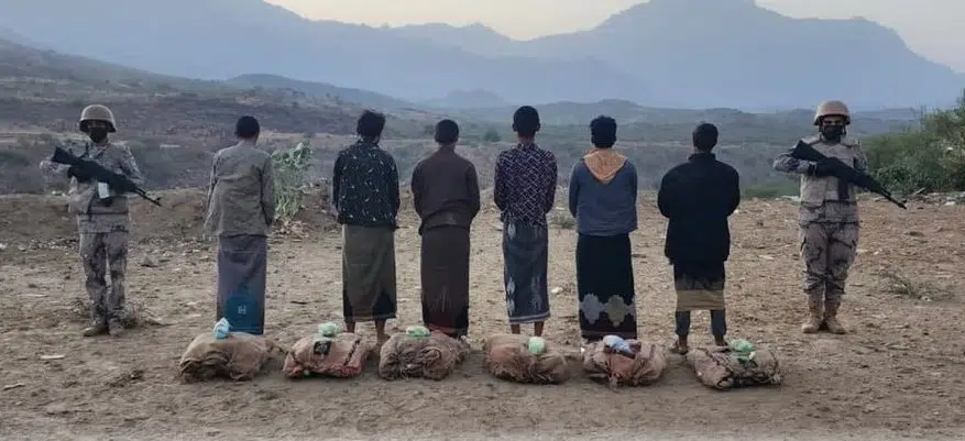 ألقت الدوريات البرية لحرس الحدود في قطاع الدائر بمنطقة جازان، القبض على 6 أشخاص من الجنسية الإثيوبية، لمخالفتهم نظام أمن الحدود، وضبط بحوزتهم 90 كيلوجرامًا من نبات القات المخدر.
