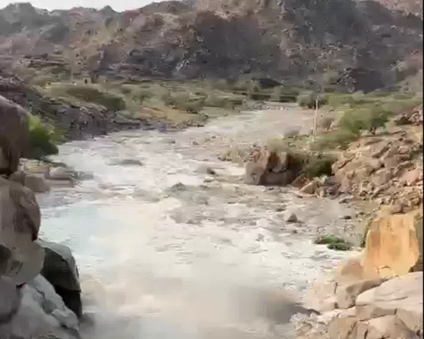 وثق مقطع فيديو متداول، جريان وتدفق السيول بوادي ضهياء شرق الليث بمنطقة مكة المكرمة، بعد هطول أمطار الخير على المنطقة.