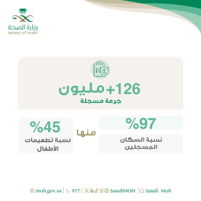 ونشرت الصحة عبر منصة إكس تفاصيل وأرقام سجل التطعيمات الإلكترونية التي تشير إلى تسجيل أكثر من 97% من السكان في السعودية فيما بلغت الجرعات المسجلة أكثر من 126 مليون جرعة بلغت نسبة تطعيمات الأطفال 45% منها.