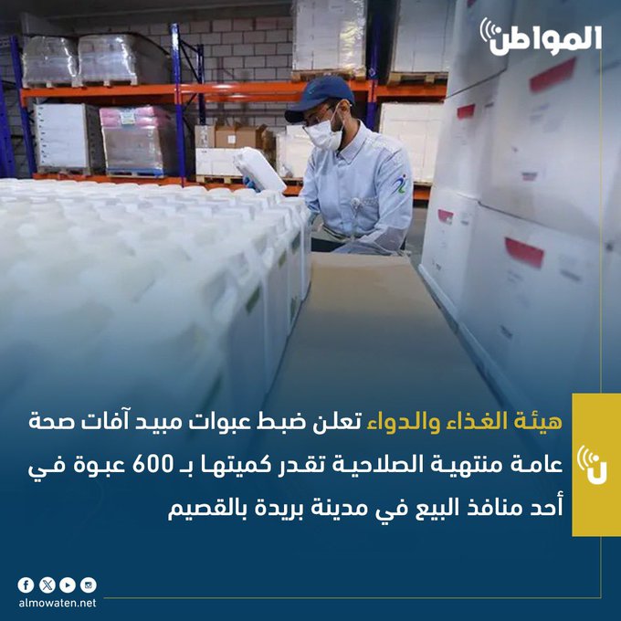 ضبطت الهيئة العامة للغذاء والدواء عبوات مبيد آفات صحة عامة منتهية الصلاحية تقدر كميتها بـ 600 عبوة في أحد منافذ البيع في مدينة بريدة بمنطقة القصيم.