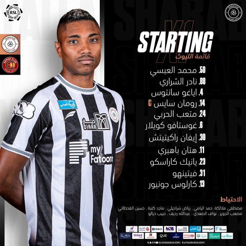 وجاء تشكيل الليوث في مباراة ضمك ضد الشباب، كالتالي؛ محمد العبسي، نادر الشراري، إياغو سانتوس، رومان سايس، متعب الحربي، غوستافو كويلار، إيفان راكيتيتش، هتان باهبري، يانيك كاراسيكو، فيتينهو وكارلوس جونيور.