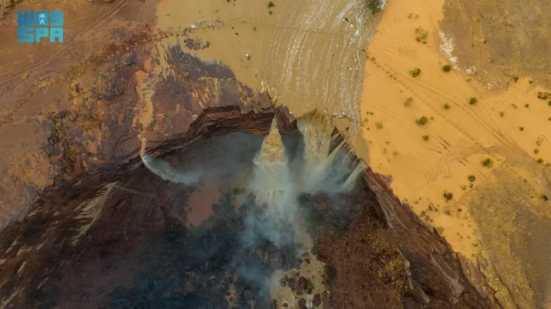 ووثقت عدسة وكالة الأنباء السعودية لحظة نزول شلال الهوية الذي يقع في محمية وادى نخلة الطبيعية، إحدى المحميات التابعة للهيئة الملكية لمحافظة العُلا، مشكلاً لوحة طبيعية خلابة.