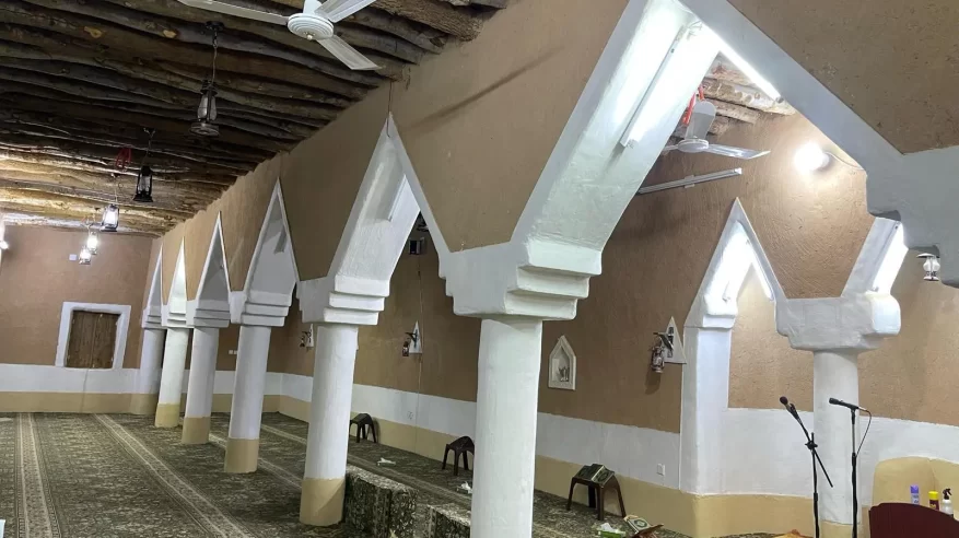 وبدئ في بنائه من الطين والحجر، على مساحة 600 مترمربع ، وملحق به بئر تسمى البعيثة لسقيا المصلين والوضوء , وبني على الطراز النجدي القديم بأعمدته الجميلة ورفوف المصاحف داخل الجدران وفوانيسه الرائعة، ويتسع لأكثر من 200 مصلي.