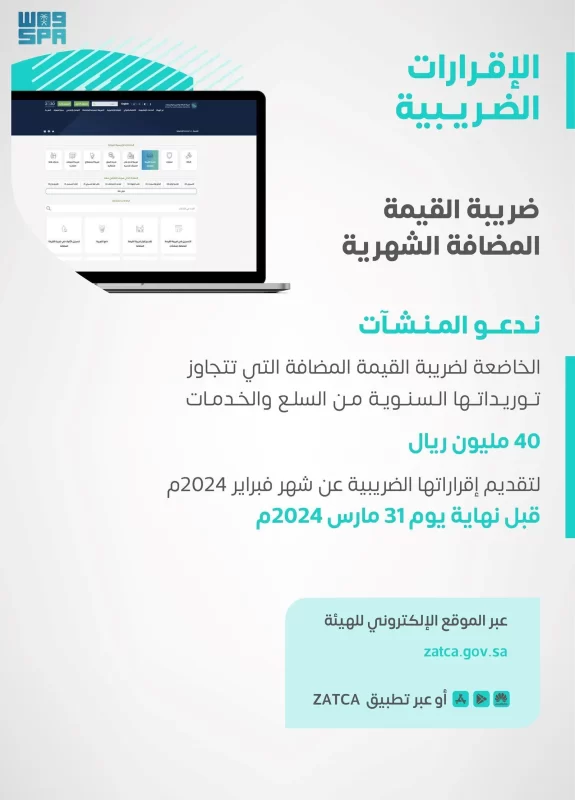 دعت هيئة الزكاة والضريبة والجمارك المنشآت من قطاع الأعمال الخاضعة لضريبة القيمة المضافة التي تتجاوز توريداتها السنوية من السلع والخدمات 40 مليون ريال إلى تقديم إقراراتها الضريبية عن شهر فبراير الماضي، وذلك في موعدٍ أقصاه 31 من شهر مارس الجاري.