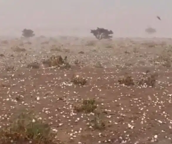وثق مقطع فيديو تساقط البرد بأحجام كبيرة شمال تربة شرق الطائف في منطقة مكة المكرمة، وسط حالة من التقلبات الجوية في المنطقة.