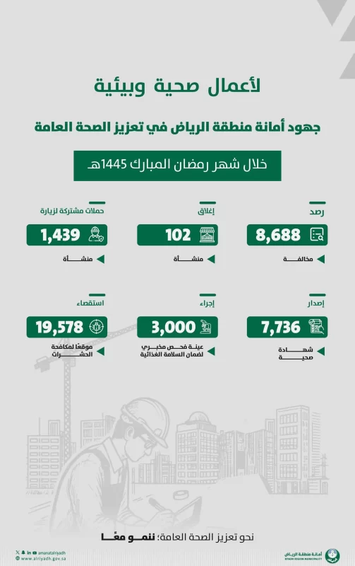 وأوضحت الأمانة أن هذه الحملات الميدانية المشتركة تأتي في إطار تكثيف الجهود لتعزيز الصحة العامة، وتوفير بيئة صحية، آمنة لمجتمع مدينة الرياض.