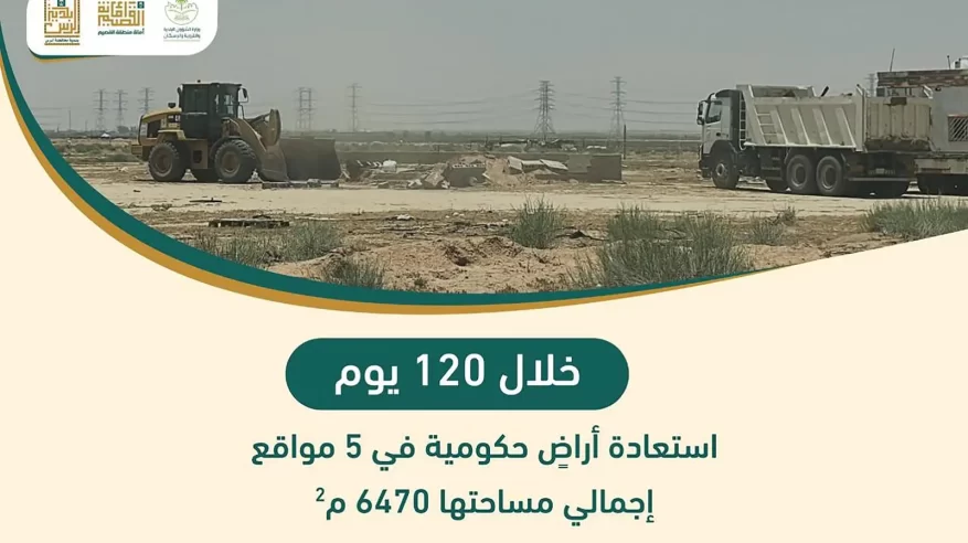 تمكنت أمانة منطقة القصيم ممثلة في بلدية محافظة الرس بمشاركة إدارة الأراضي والممتلكات بالتعاون مع لجنة مراقبة عقارات الدولة وإزالة التعديات في محافظة الرس، من استعادة أراضٍ حكومية بمساحة 6.470 مترًا مربعًا خلال 120 يومًا ، وذلك ضمن الجهود الميدانية والمتابعة المستمرة للحد من التجاوزات والعشوائيات والحفاظ على الممتلكات العامة.