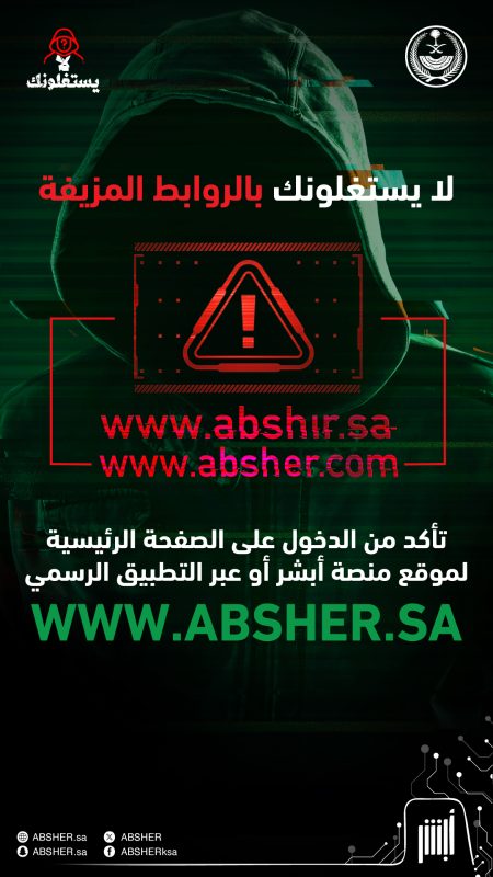 وقالت أبشر عبر حسابها على منصة “إكس”، “لا يستغلونك بالروابط المزيفة وتأكد دائمًا من الدخول لمنصة أبشر من خلال الموقع الرسمي (هنا) أو عبر التطبيق الرسمي (هنا).
