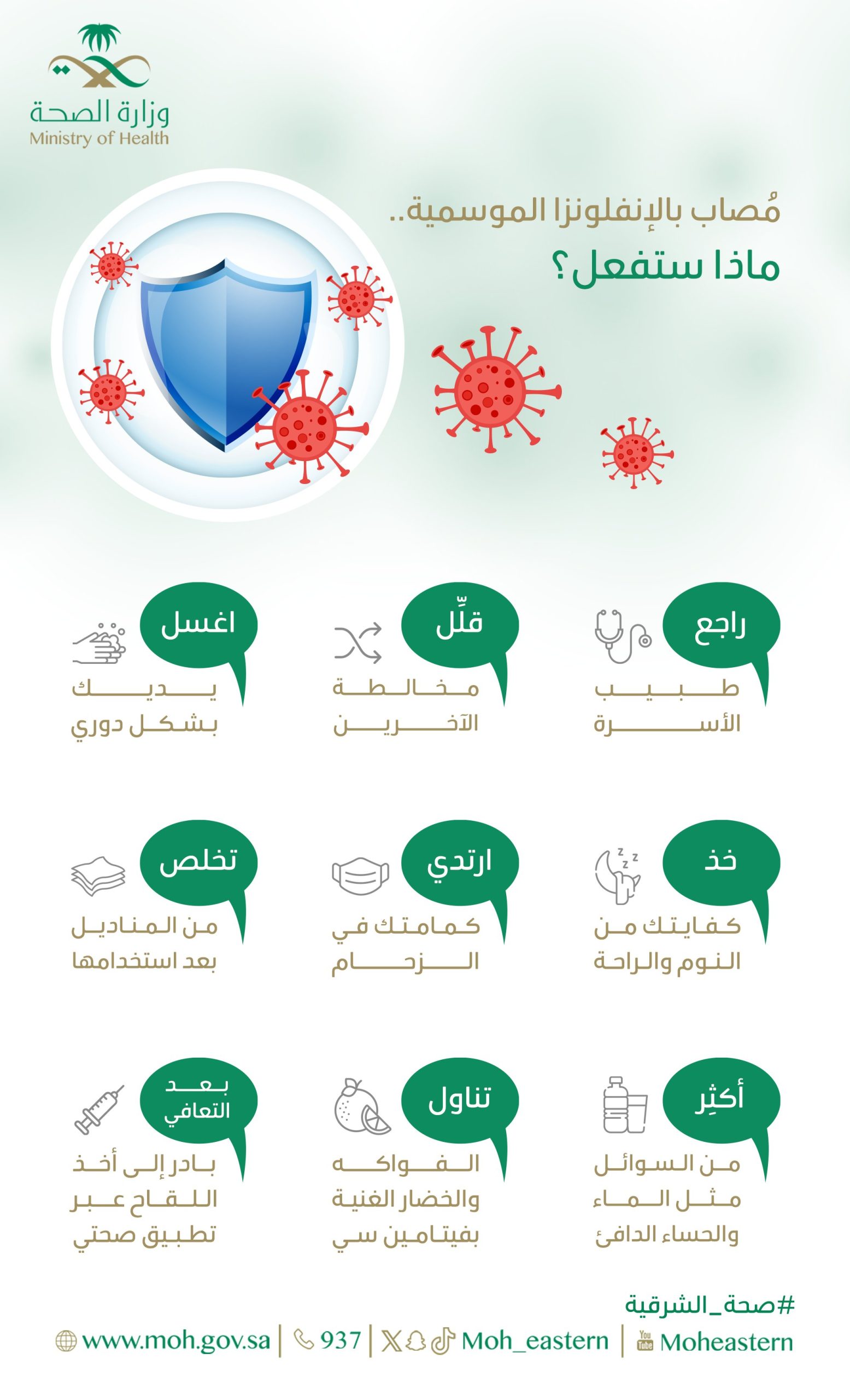 وقالت صحة الشرقية في إنفوجراف صادر عنها إنه حال الإصابة بالإنفلونزا الموسمية يجب اتخاذ الخطوات التالية: مراجعة الطبيب، التقليل من مخالطة الآخرين، غسل اليدين بشكلٍ دوري، وأخذ كميات نوم وراحة كافية.