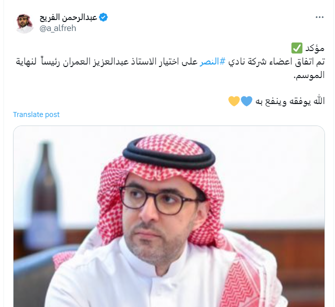 وبعد تلك التغريدة لم تستمر سوى دقائق ثم حُذفت من على حساب العمران بمنصة “إكس” ليتأكد بعدها أنه بات قريبًا من رئاسة المؤسسة غير الربحية لنادي النصر خلفًا لإبراهيم المهيدب.