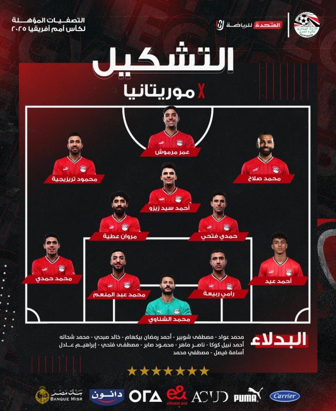 واعتمد حسام حسن، على أحمد عيد كظهير أيمن بدلًا من محمد هاني المصاب، فيما يقود الهجوم الثنائي محمد صلاح، عمر مرموش، واحتفظ بالنجم مصطفى محمد على مقاعد البدلاء.