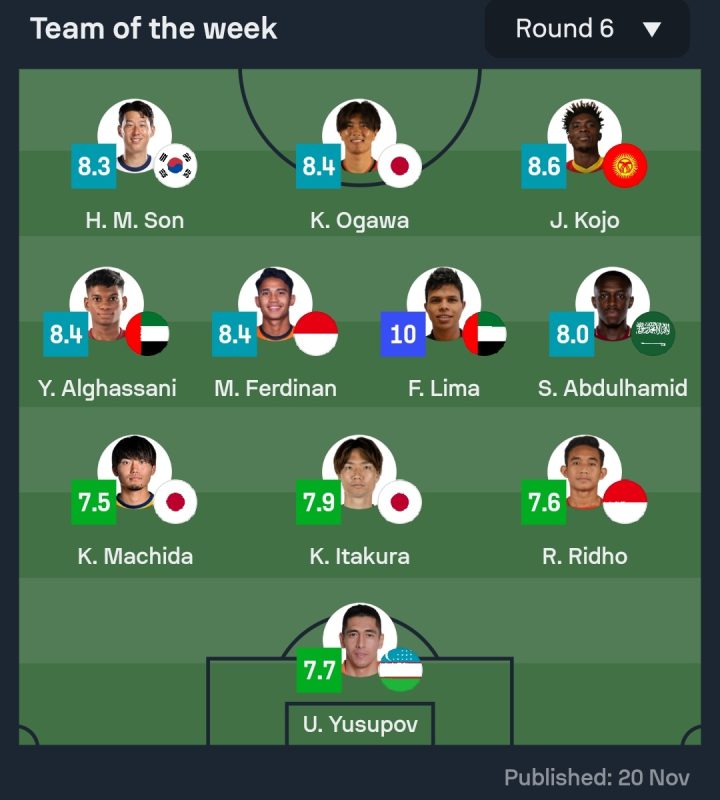 وجاءت التشكيلة المثالية للجولة السادسة بالتصفيات الآسيوية النهائية، كالتالي؛ الأوزبكستاني أوتكير يوسوبوف في حراسة المرمى، بجانب سعود عبدالحميد، وجويل كوجو من قيرغيزستان.