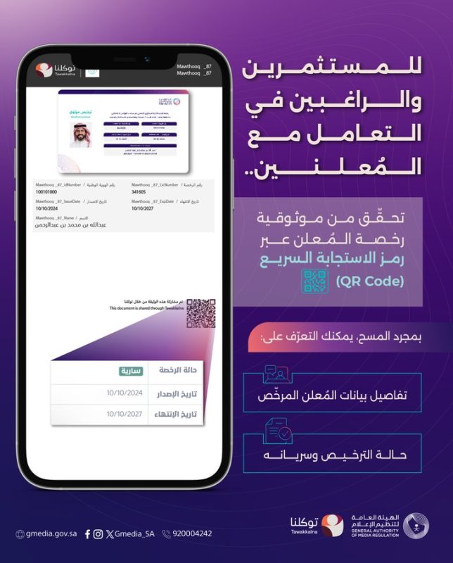 وقالت الهيئة، عبر حسابها في منصة إكس: “مستثمر أو مهتم بالتعامل مع المعلنين؟ الآن يمكنك التحقق من موثوقية المُعلن بكل سهولة ودقة عبر التطبيق الوطني الشامل “توكلنا”؛ من خلال رمز الاستجابة السريع (QR Code) الموجود في البطاقة الرقمية لترخيص موثوق”.