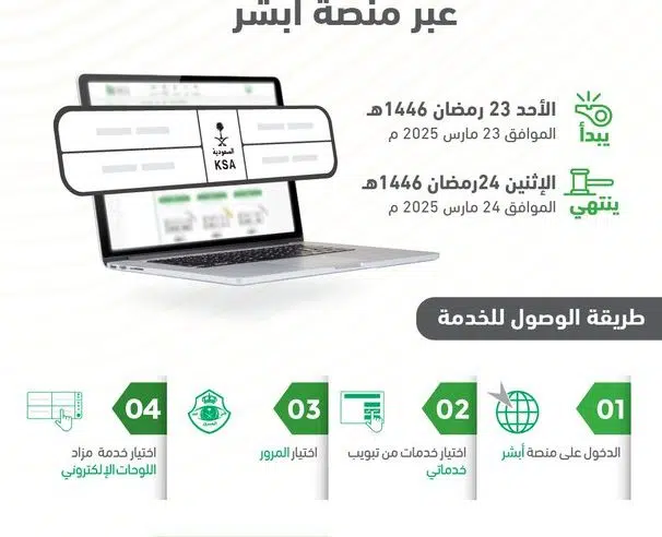 وأوضحت الإدارة، عبر منصة حسابها في منصة إكس، أن المزاد يتم طرحه عبر منصة أبشر التي تمكّن الراغبين في شراء اللوحات المميزة من المشاركة في المزاد إلكترونيًّا.