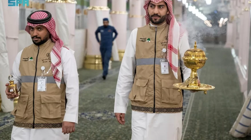 وتأتي أعمال التطييب والتبخير ضمن جهود الهيئة لخدمة الزوّار والمصلين؛ ليؤدوا عبادتهم بطمأنينة وخشوع.